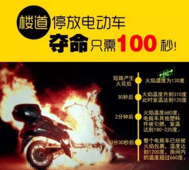 电瓶车引发火灾的致命威胁是火场温度和毒烟,一旦发生事故,夺命只需100秒!