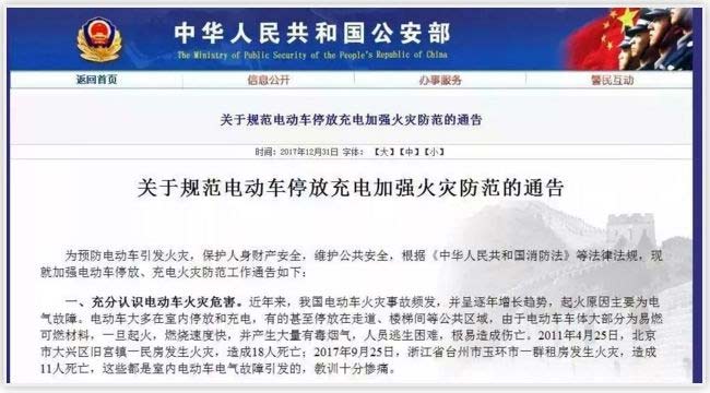 2017年底,公安部就紧急下发通告,要求规范电动车停放充电行为,严厉查处违规停放充电行为。